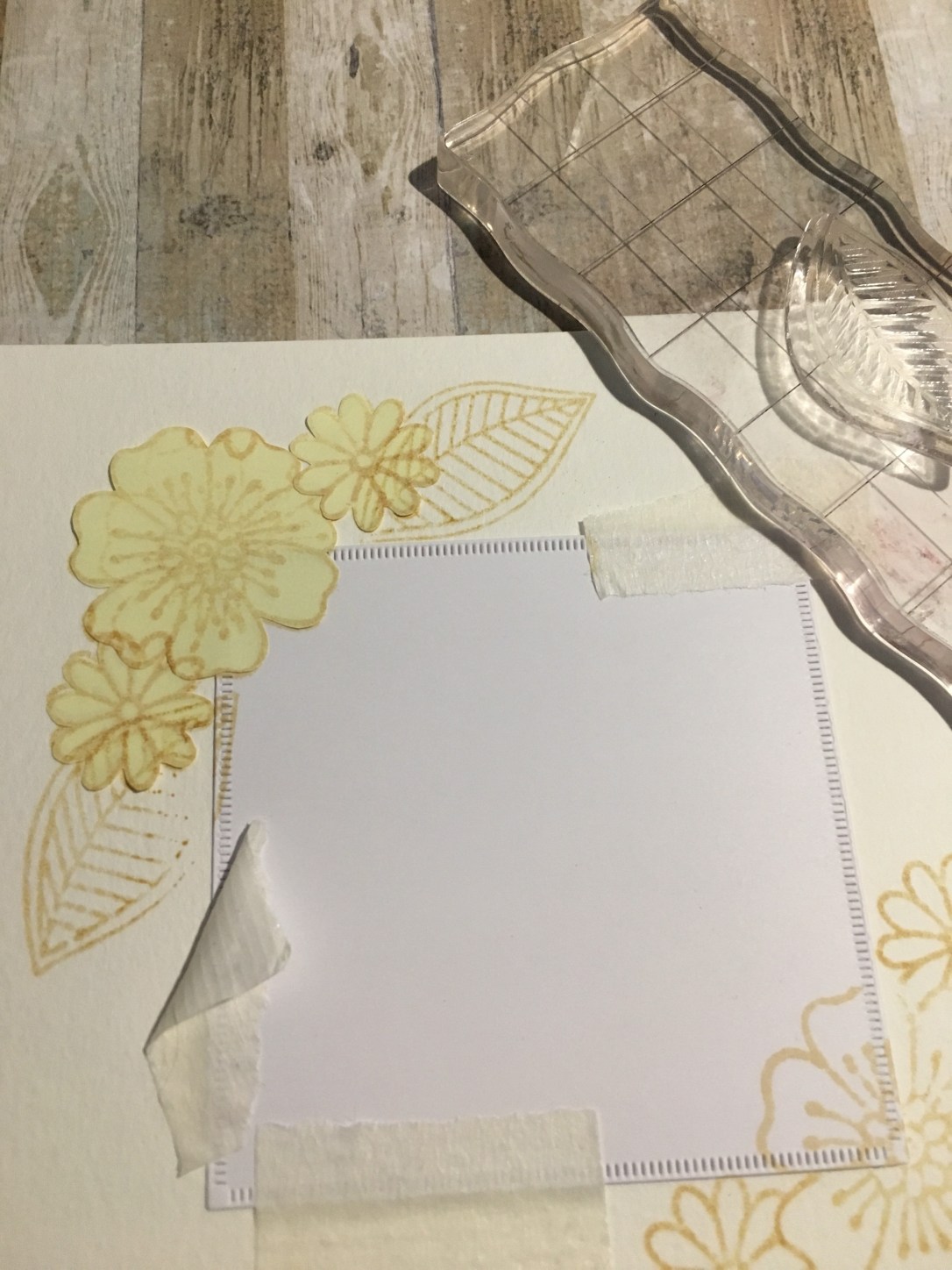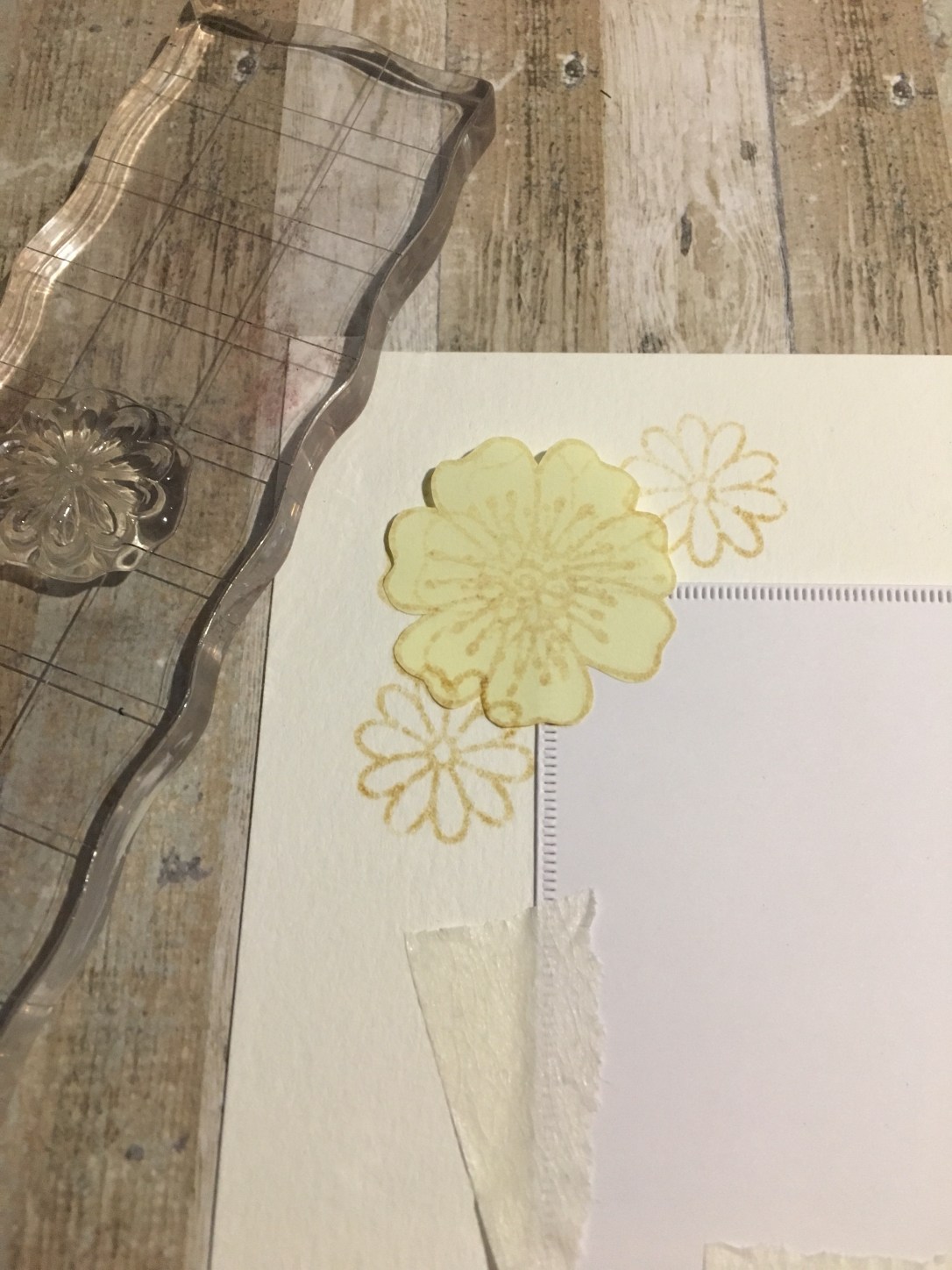 Passiamo al masking: per prima cosa fustella un quadrato della misura più piccola di quei due che hai usato prima, e attaccalo al centro del pezzo di carta acquarellabile. Per i fiori: (io ho realizzato una colorazione no line, quindi ho usato il Distress Ink Antique Linen per timbrare) timbra il primo fiore, e, lo stesso, fai su un post-it, dalla parte che dietro ha la striscia adesiva, ritaglialo a filo e attaccalo sulla tua prima timbrata, passa quindi ai secondi fiori, che dovranno essere un pochino sovrapposti al primo per sembrare dietro rispetto al primo fiore, una volta che toglierai la mascheratura.