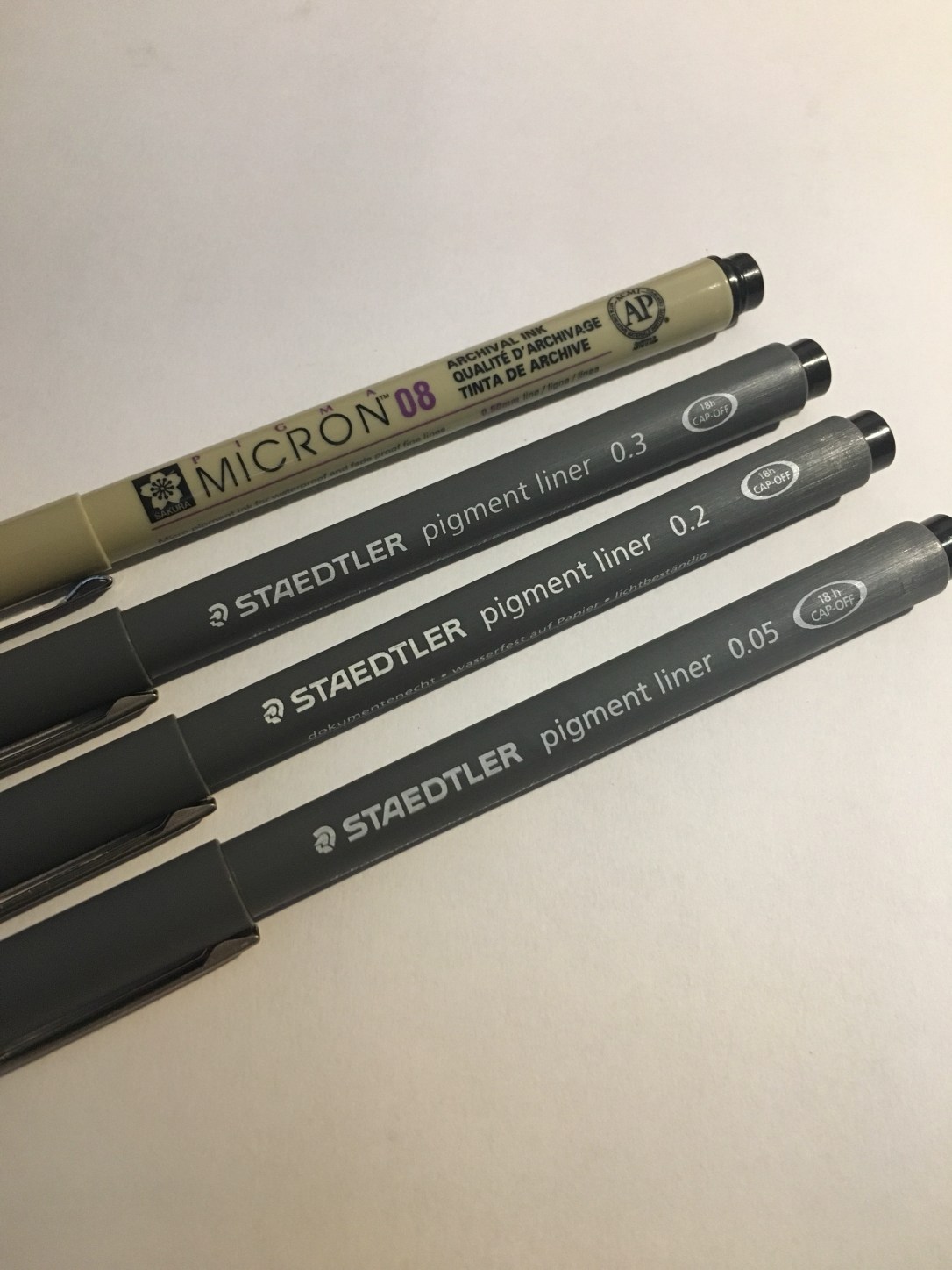 I pennarelli che uso per ripassare le righe a matita sono questi, sono tutti indelebili su carta (e non indelebili in generale, perchè è più facile che sbavino)!
