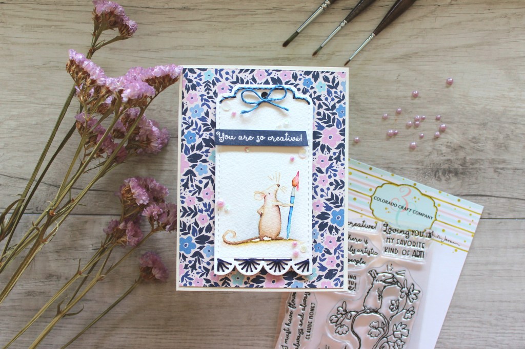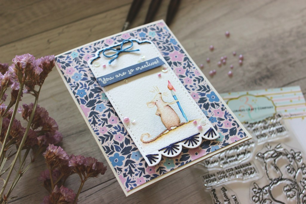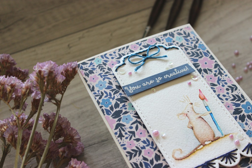 Il design è abbastanza pulito anche se ho provato ad aggiungere una carta patterned per dare un tocco diverso; non mi capita spesso di aggiungere carte che abbiano già una fantasia ad una illustrazione acquerellata perchè mi riesce molto difficile riuscire a trovare il giusto pattern per ogni disegno. Ma questo mi sembrava proprio perfetto, come se il topolino stesse dipingendo i fiorellini sullo sfondo. Che dici, esperimento riuscito?